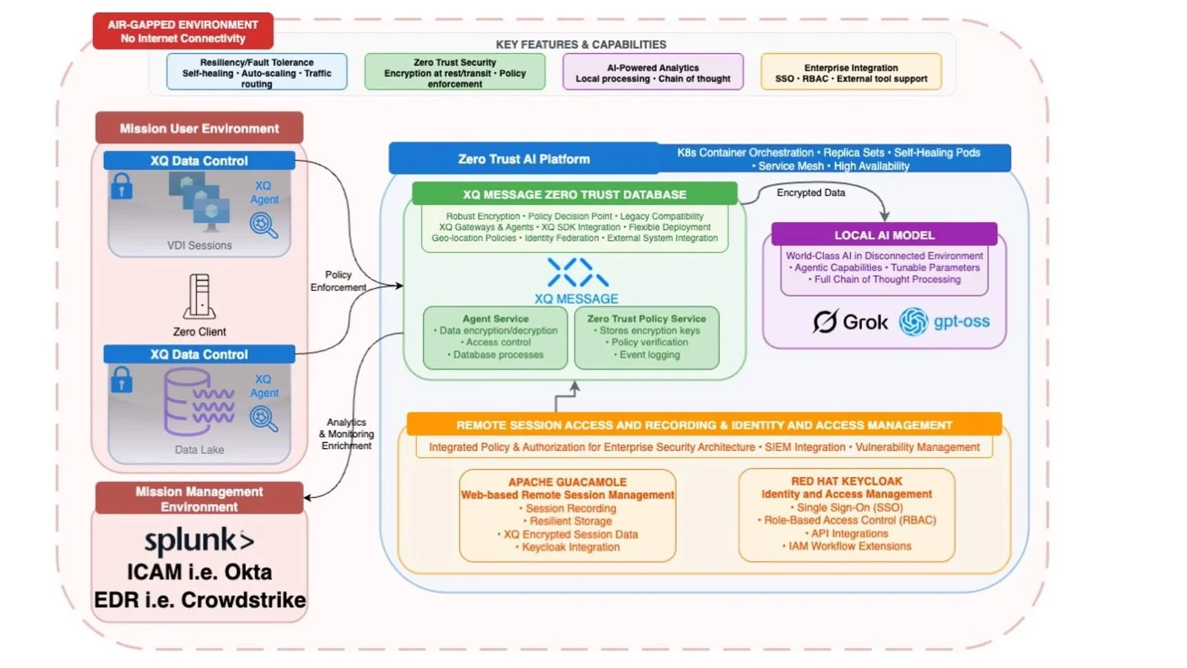 2 Twelve Solutions, LLC (2 Twelve), in collaboration with XQ Message (XQ), has developed a Zero Trust Artificial Intelligence (ZTAI) solution that ensures that 1/ sensitive input data can only be read by authorized AI models and 2/ output data can only be read by authorized personnel. The Zero Trust AI supports OpenAI's GPT-OSS and xAI's Grok-1, without internet connectivity in an air-gapped environment. The base layer is the hardened, on-premise physical and logical platform host that can be delivered to a classified enclave.